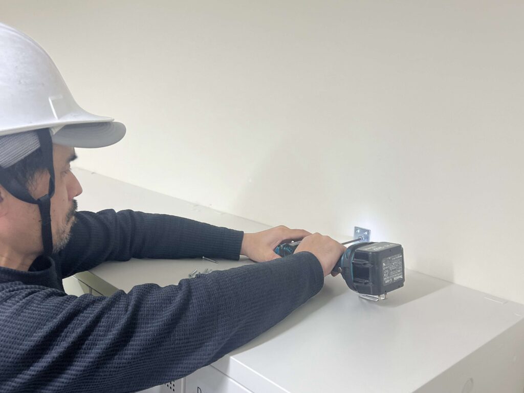 構造的に強度のある壁に対して、L字金具などを用いて固定する方法です。比較的施工しやすく、確実な効果が期待できるため、多くのオフィスで採用されています。